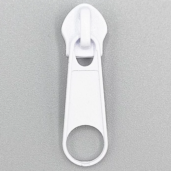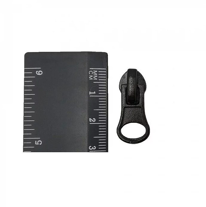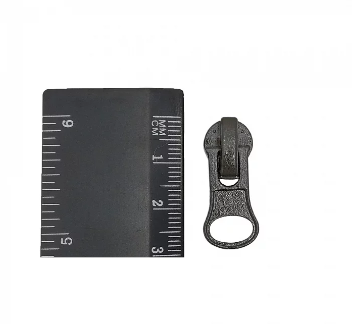 - бегунок (замок автомат) для молнии с зубцами из пластмассы, закругленный в верхней части и расширенный;