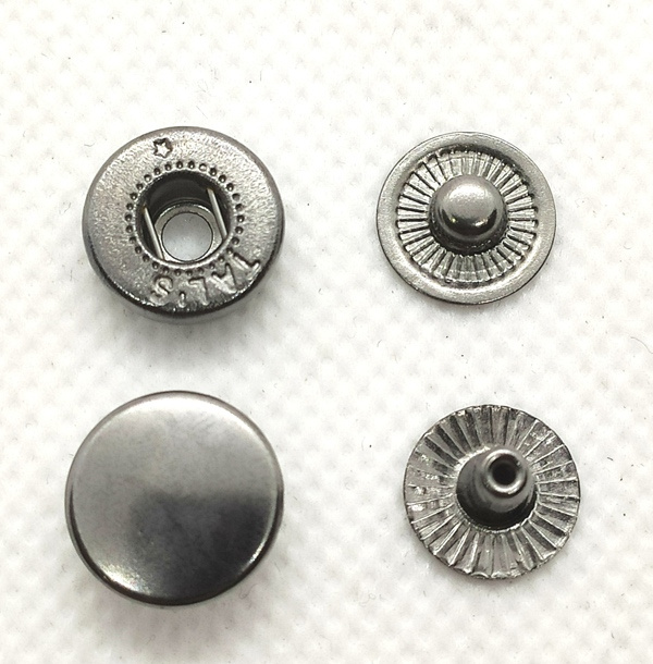 - Система крепления Альфа (№54) эту кнопку используют преимущественно для верхней одежды мужской , женской или детской ,а также на кошельки и сумки.Диаметр механизма защелкивания бывает: 12,5мм, 15 мм.Цветовая гамма металлических кнопок: антик, никель, золото, темный никель, оксид. Для установки нужен пресс и насадка для этих кнопок.