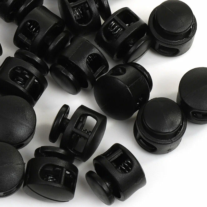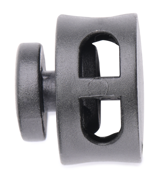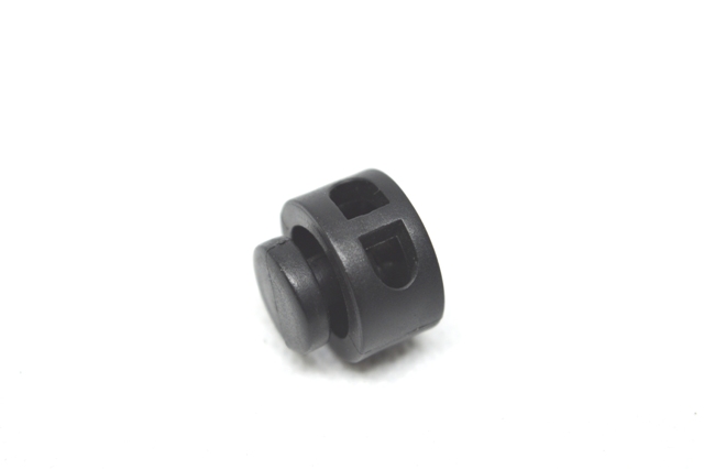 Фиксатор для шнура 27001 СБ «Бочка» большой, чёрный, доступен в фасовке 50 и 500 штук. Это пластиковый двухдырочный стопор, предназначенный для фиксации шнуров в текстильных изделиях: одежде, обуви, рюкзаках, палатках, тентах и других.Характеристики