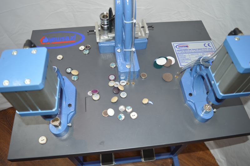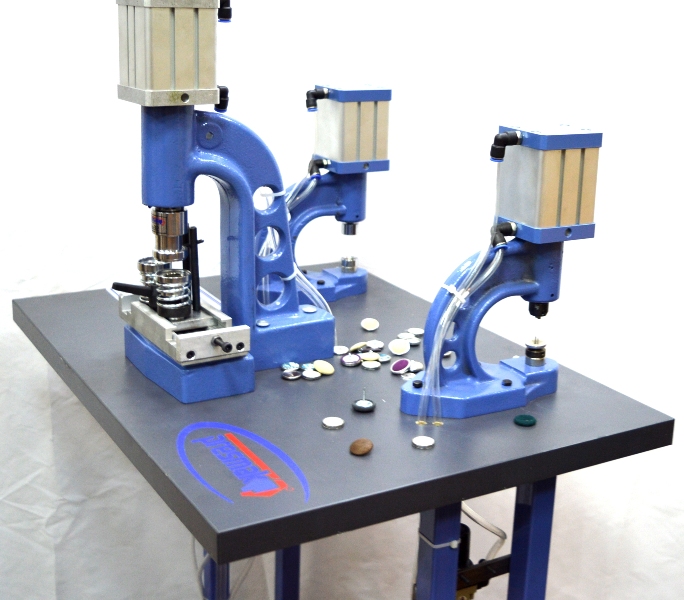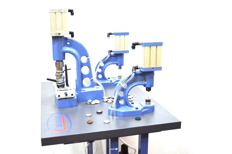 Фактически, данный вид оборудования, представляет собой, три отдельно стоящих пресса на одном столе, один из которых обтягивает пуговицу как пресс 4125, второй вальцует кольцо на пуговицу ,а третий устанавливает сразу два микролюверса на обтянутую пуговицу .
