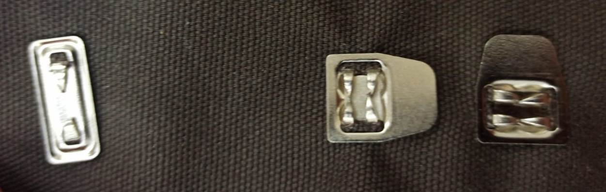 Они массивнее, чем обычные пришивные крючки, но и значительно прочнее их. Такие крючки отлично удерживают края застежек на изделиях даже из толстой ткани.