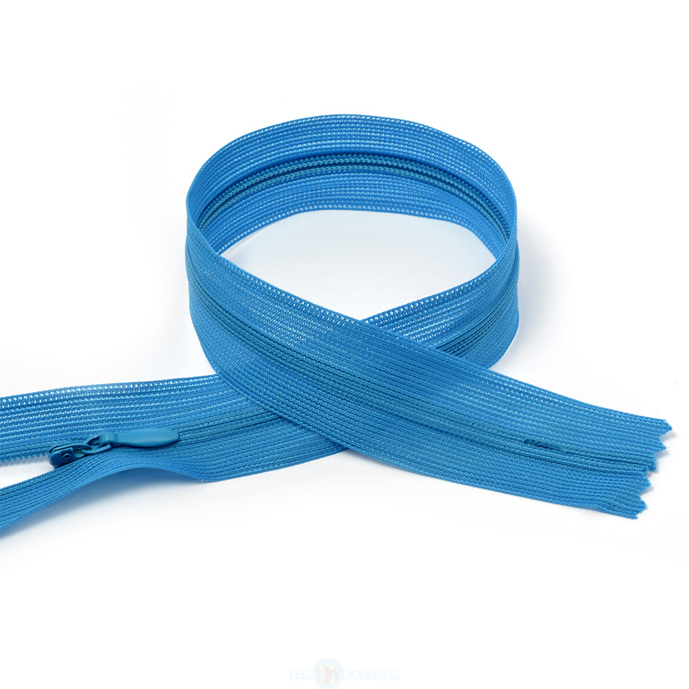 Молния потайная Т3 50см №216 Голубой ( уп.100 шт.)Потайная (скрытая) молния — это особый вид застёжки, которая при застегнутом положении практически незаметна с лицевой стороны изделия. Звенья расположены с изнаночной стороны и прикрыты текстильной лентой: снаружи виден то