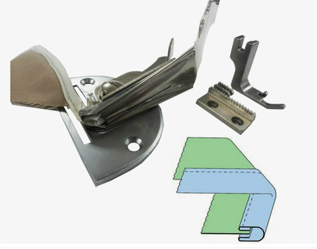 Окантователь 4 сложения (с закрытыми срезами) встроенный в комплекте с рейкой и лапкой к прямострочным машинам.Окантователь- это приспособление, которое специальным образом обрабатывает край ткани, заворачивая бейку вокруг него. Таким образом обычно обрабатывают горловины и края детских изделий: боди, скипы, нижнее белье и прочее.
